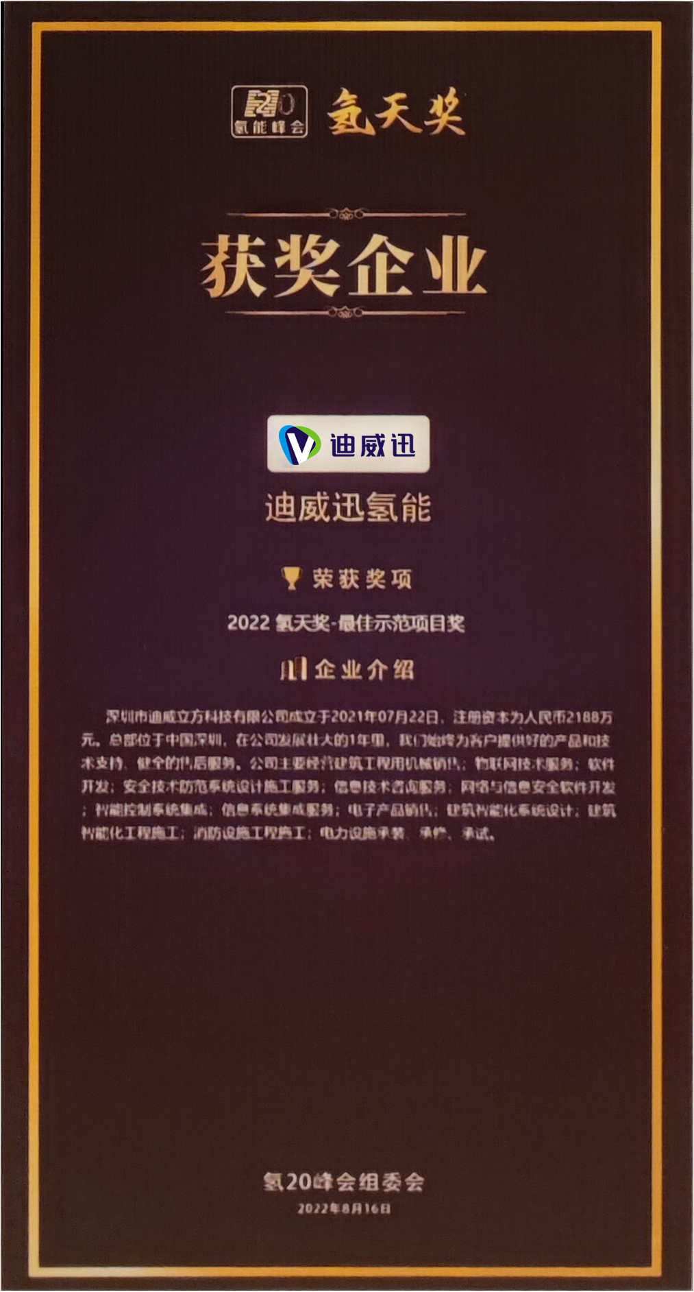 2022年8月16日,氫20峰會氫天獎在深圳市福田會展中心舉辦頒獎典禮,迪威迅氫能項(xiàng)目榮獲企業(yè)獎最佳示范獎。